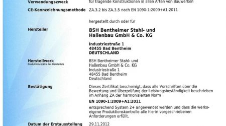Die BSH Bentheimer Stahl- und Hallenbau GmbH & Co. KG ist ab sofort berechtigt, nach EN 1090 bis zur Ausführungsklasse EXC4 zu fertigen.